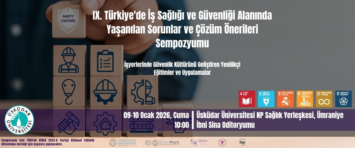 “IX. Türkiye’de İş Sağlığı ve Güvenliği Alanında Yaşanılan Sorunlar ve Çözüm Önerileri Sempozyumu”nun bu yılki teması olarak İşyerlerinde Güvenlik Kültürünü Artıran Yenilikçi Eğitimler ve Uygulamalar olarak belirlenmiştir. Hibrit olarak gerçekleştirilecek sempozyumumda, yüz yüze olarak 09 Ocak 2026 tarihinde saat 10:00'da başlaması planlanan sempozyum Üsküdar Üniversitesi NP Sağlık Yerleşkesi, Ümraniye İbni Sina Konferans Salonu’nda gerçekleştirilecektir. 10 Ocak 2026 tarihinde çevrimiçi olarak bildiri sunumları yapılması planlanmaktadır.